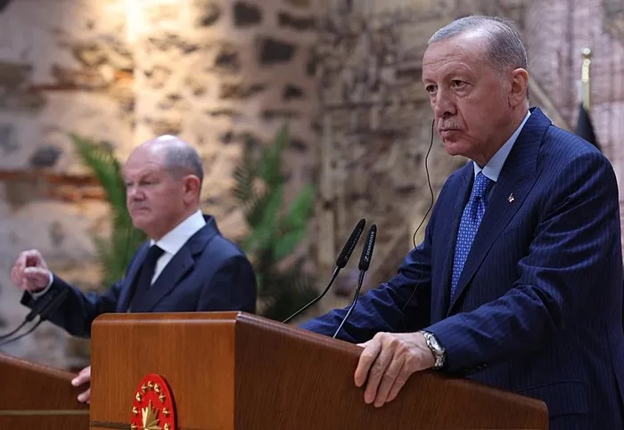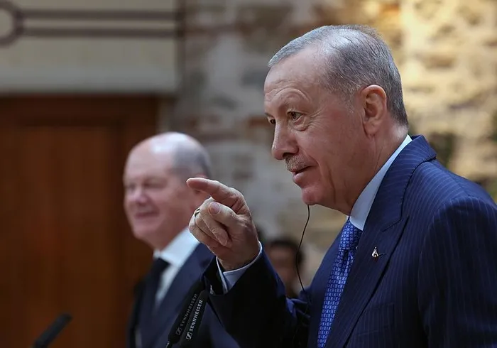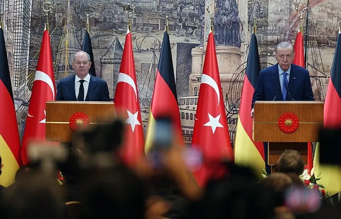 Şansölye Scholz’la üzerinde durduğumuz önemli konu başlıklarından biri de savunma sanayii alanındaki işbirliğimizdi. Savunma sanayii ürünlerinin tedariki bağlamında geçmişte yaşanan bazı sıkıntıları artık geride bırakarak işbirliğimizi geliştirmeyi arzu ediyoruz. Bu konuda değerli dostum Scholz’un gayretlerini takdirle karşıladığımızı bugün bir kez daha ifade etmek istiyorum.